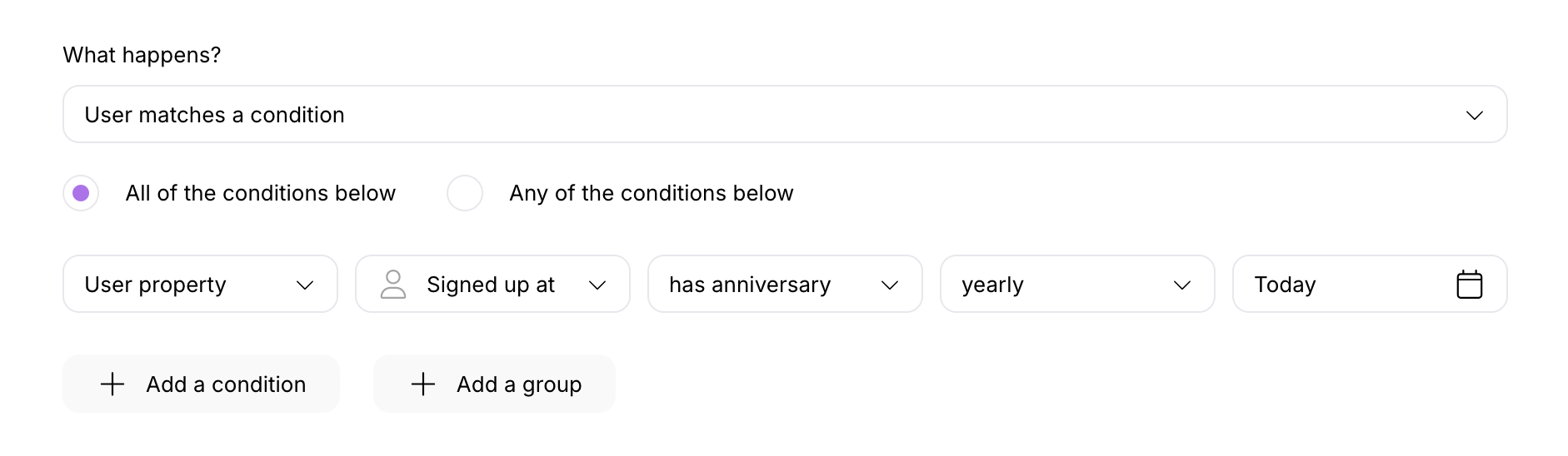 To do that, select a trigger type “user matches a condition” (or “company matches a condition”). Then select a date property and choose “has anniversary” in the operators dropdown.