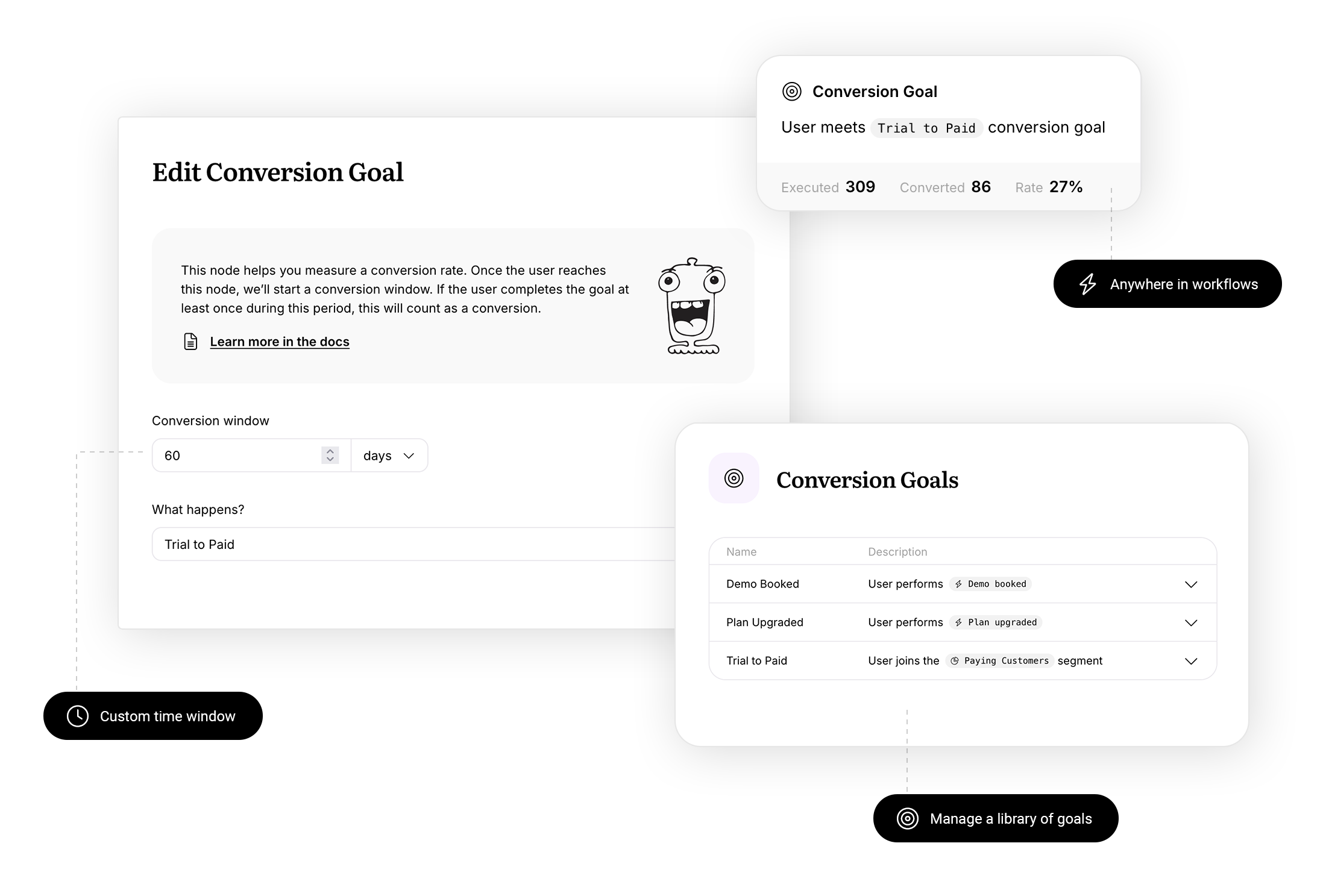 No third-party tools needed. Track behavior outcomes using the data you already collect. Place a Conversion Goal node anywhere in your workflow, set a time window, and watch the numbers roll in.