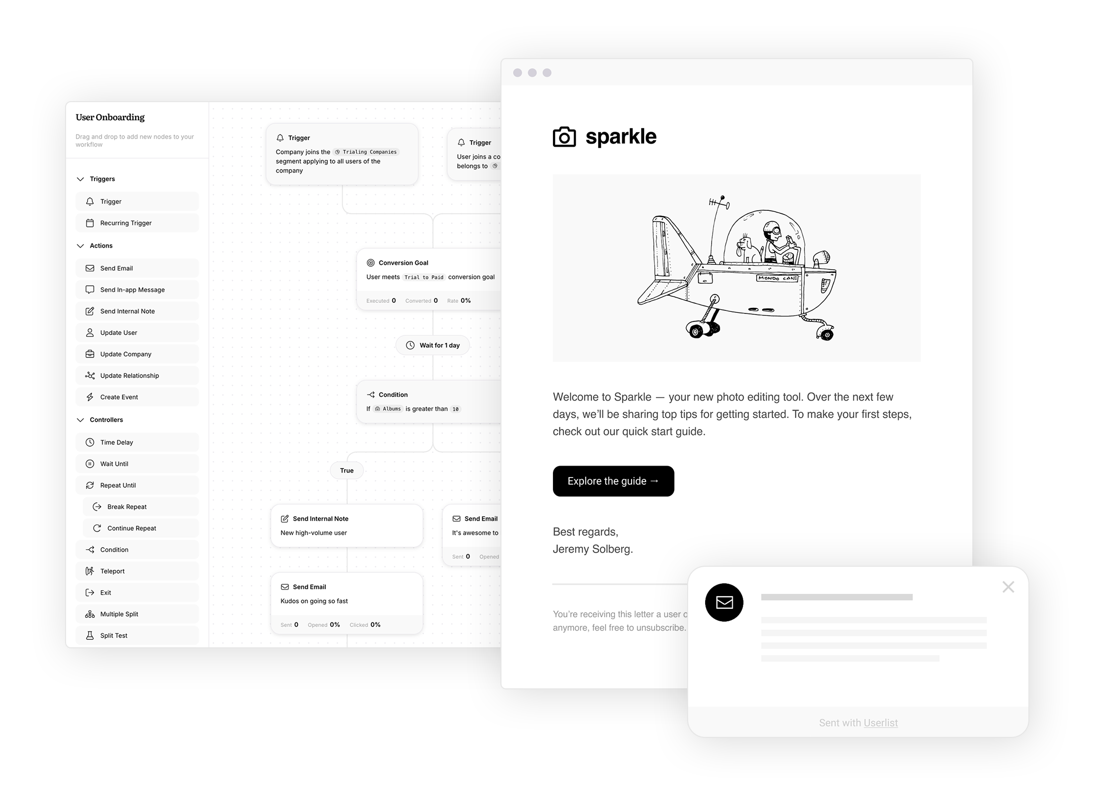 Userlist helps you automate dozens of business use cases, all in one messaging tool. Start with user onboarding and add more, step by step.